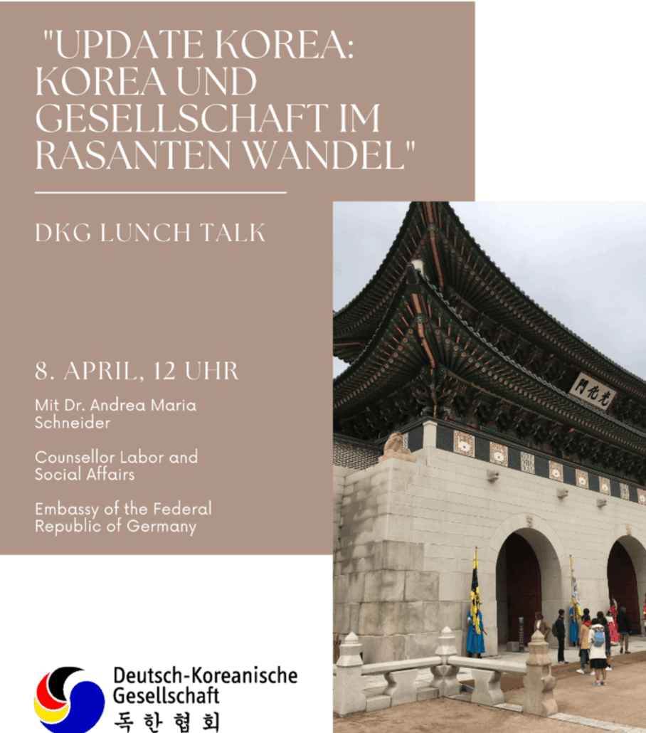 Am 8. April hat der erste digitale DKG Lunch Talk mit Frau Dr. Andrea Schneider, Sozialreferentin an der Deutschen Botschaft in Seoul, stattgefunden. Themen waren der rasante Wandel in der koreanischen Gesellschaft und die aktuellen Entwicklungen rund um das Amtsenthebungsverfahren des nunmehr ehemaligen Präsidenten Yoon.
