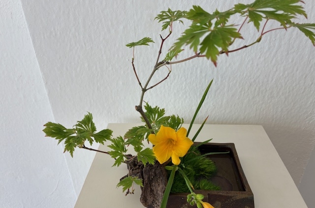 „Die Beweglichkeit der Landschaft teilen die Werke Hannes Rötters mit den Ikebana-Arrangements von Zoo-Lan Lee-Rötter. Auch diese Arrangements sind Landschaften, aber sie sind auch Skulpturen und fordern das Publikum immer wieder neu dazu auf, die Position zu wechseln, sich mal näher, mal weiter weg einzustellen und mal ein Detail, mal das Ganze in den Blick zu nehmen. Darüber hinaus verändern sich die Gestecke über die Zeit der Ausstellung. Welkende Blätter fügen dem Arrangement eine neue Farbe zu, andere Stellen verblassen, und nach ein paar Tagen wird die Komposition ergänzt, aktualisiert, erneuert.