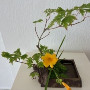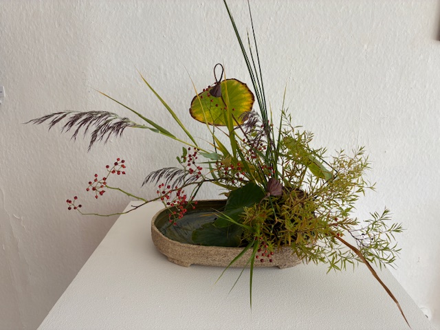 „Die Beweglichkeit der Landschaft teilen die Werke Hannes Rötters mit den Ikebana-Arrangements von Zoo-Lan Lee-Rötter. Auch diese Arrangements sind Landschaften, aber sie sind auch Skulpturen und fordern das Publikum immer wieder neu dazu auf, die Position zu wechseln, sich mal näher, mal weiter weg einzustellen und mal ein Detail, mal das Ganze in den Blick zu nehmen. Darüber hinaus verändern sich die Gestecke über die Zeit der Ausstellung. Welkende Blätter fügen dem Arrangement eine neue Farbe zu, andere Stellen verblassen, und nach ein paar Tagen wird die Komposition ergänzt, aktualisiert, erneuert.